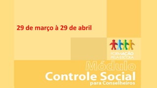 O documento trata do acompanhamento e controle social nas políticas públicas educacionais, destacando a participação da sociedade na fiscalização e execução dos recursos do Fundeb e outros programas. Aborda também a importância dos conselhos de acompanhamento e controle, seus papéis e responsáveis na gestão pública. O módulo inclui orientações para a atividade final, autoavaliação e canais de comunicação com a tutora.