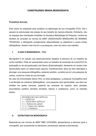 Este documento fornece instruções para a elaboração de uma monografia, incluindo sua estrutura e elementos. A estrutura proposta inclui elementos pré-textuais, textuais e pós-textuais, como capa, resumo, introdução, revisão de literatura e referências. Orienta sobre como formular objetivos gerais e específicos, citar fontes e estruturar o conteúdo em capítulos.
