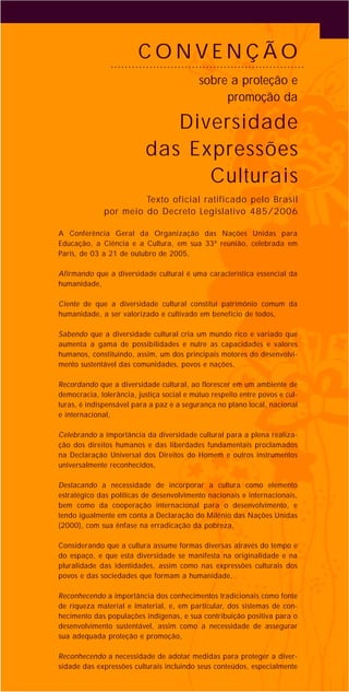 A Convenção sobre a Proteção e Promoção da Diversidade das Expressões Culturais estabelece a importância da diversidade cultural como patrimônio da humanidade e motor para o desenvolvimento sustentável. Os objetivos incluem proteger as expressões culturais, promover o diálogo intercultural e garantir liberdade de pensamento e expressão. A convenção reconhece a responsabilidade dos Estados em adotar políticas que assegurem a diversidade cultural e a cooperação internacional para seu fortalecimento.