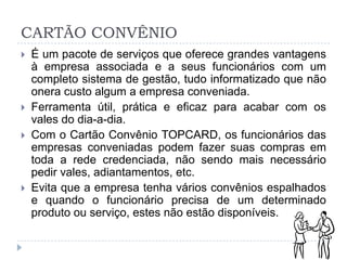 O cartão convênio Topcard oferece uma solução de gestão de pagamento para empresas que elimina a necessidade de vales e adiantamentos para os funcionários, proporcionando mais controle e segurança. Os empregadores se beneficiam com a racionalização dos pagamentos e a valorização dos funcionários, enquanto os lojistas garantem o recebimento ágil das vendas, sem complicações de crédito. Além disso, o sistema digital proporciona facilidade na administração e personalização, promovendo uma imagem mais moderna e competitiva para as empresas emissoras.