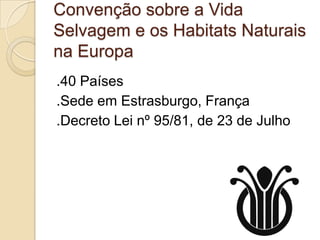 A Convenção de Berna estabelece objetivos para conservar a vida selvagem e habitats naturais na Europa, protegendo espécies listadas nos anexos e proibindo métodos de captura prejudiciais. Ela foi assinada por 40 países e tem sede na França, visando proteger a fauna, flora e seus habitats naturais.