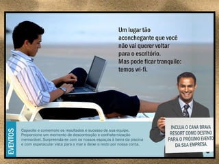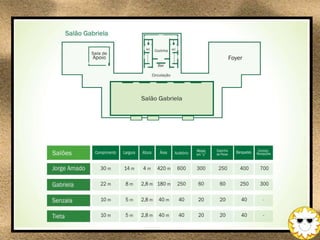 O documento descreve as instalações e serviços de um resort de convenções e lazer localizado em Ilhéus, Bahia, Brasil, que oferece quatro salões para eventos com capacidade total de 70 mil metros quadrados, além de espaços ao ar livre, contatos telefônicos e endereço eletrônico para reservas.