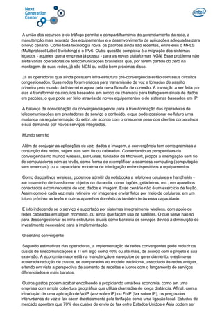 O documento discute a convergência tecnológica entre telecomunicações e TI, possibilitada pela digitalização e popularização da Internet. A convergência permite reunir voz, dados e imagens em um único dispositivo ou rede, gerando economias para empresas. Tecnologias como Ethernet, Frame Relay e IP vêm integrando essas redes de forma convergente.