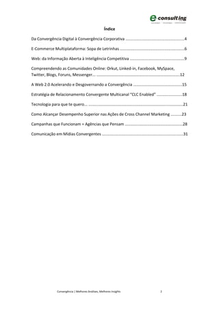 O documento discute a convergência no comércio eletrônico e como as empresas precisam se adaptar para vender produtos e serviços em múltiplas plataformas digitais, como celulares, TV e dispositivos universais. Apesar do potencial, desafios como custos de conexão e tecnologias de segurança ainda limitam o crescimento do comércio eletrônico multiplataforma no Brasil.