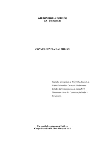 1. O documento discute o conceito de convergência midiática e como diferentes meios de comunicação, como jornais, rádio e televisão, estão se adaptando à internet.