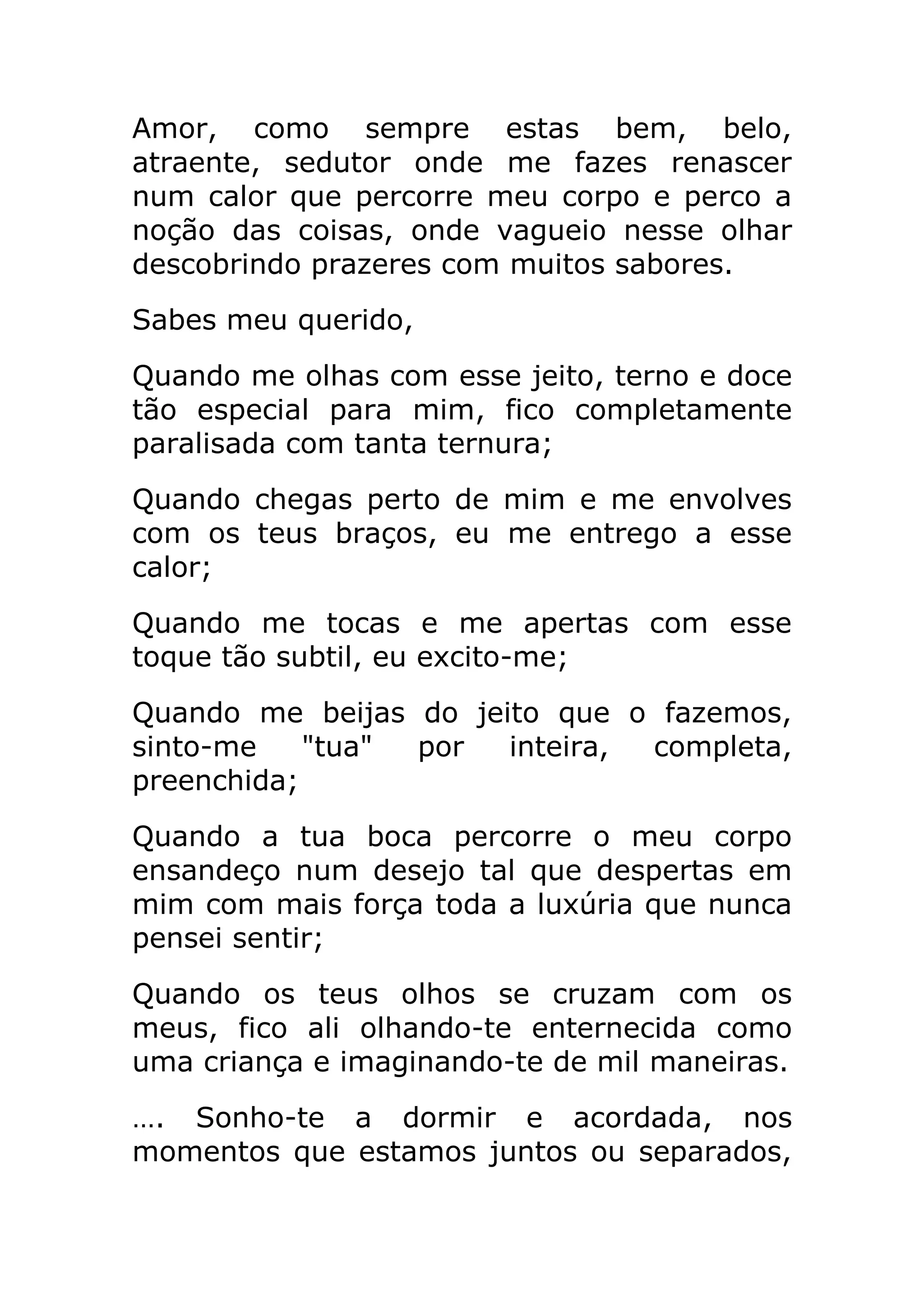 O documento é uma carta de amor onde o autor expressa seu amor profundo por seu parceiro, descrevendo como se sente intensamente atraído e excitado por ele fisicamente e emocionalmente. Ele fala sobre como se sente revigorado e perde a noção das coisas quando está com seu amado, e como se entrega de corpo e alma a ele durante os momentos íntimos que compartilham.