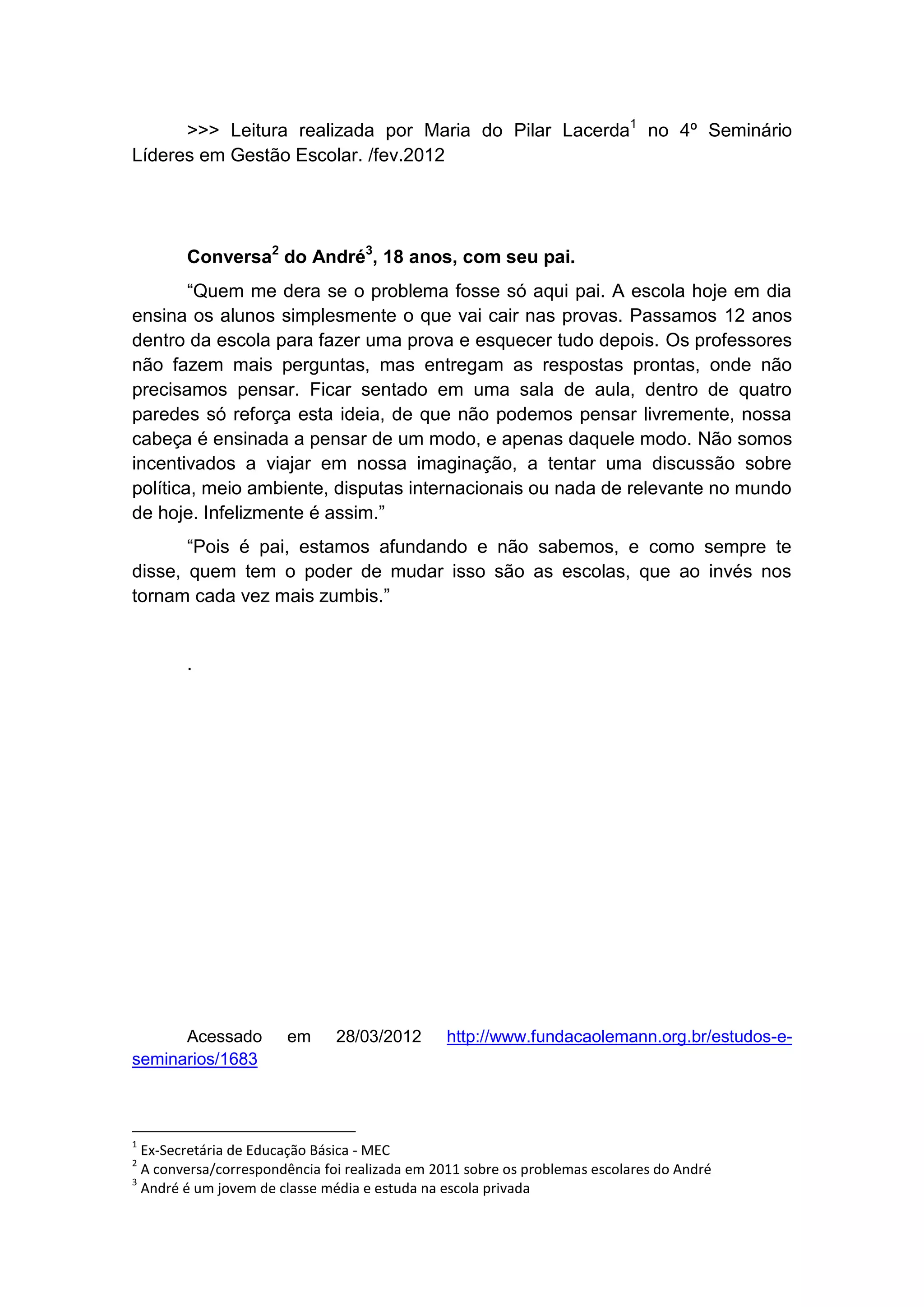 O documento relata uma conversa entre um jovem, André, e seu pai, onde André expressa insatisfação com o sistema educacional atual, afirmando que as escolas ensinam apenas para aprovação em provas, não estimulando o pensamento crítico ou discussões relevantes. Ele critica a falta de incentivo à imaginação e à liberdade de pensamento, descrevendo a educação como um processo que cria 'zumbis'. André acredita que a mudança necessária depende das escolas.