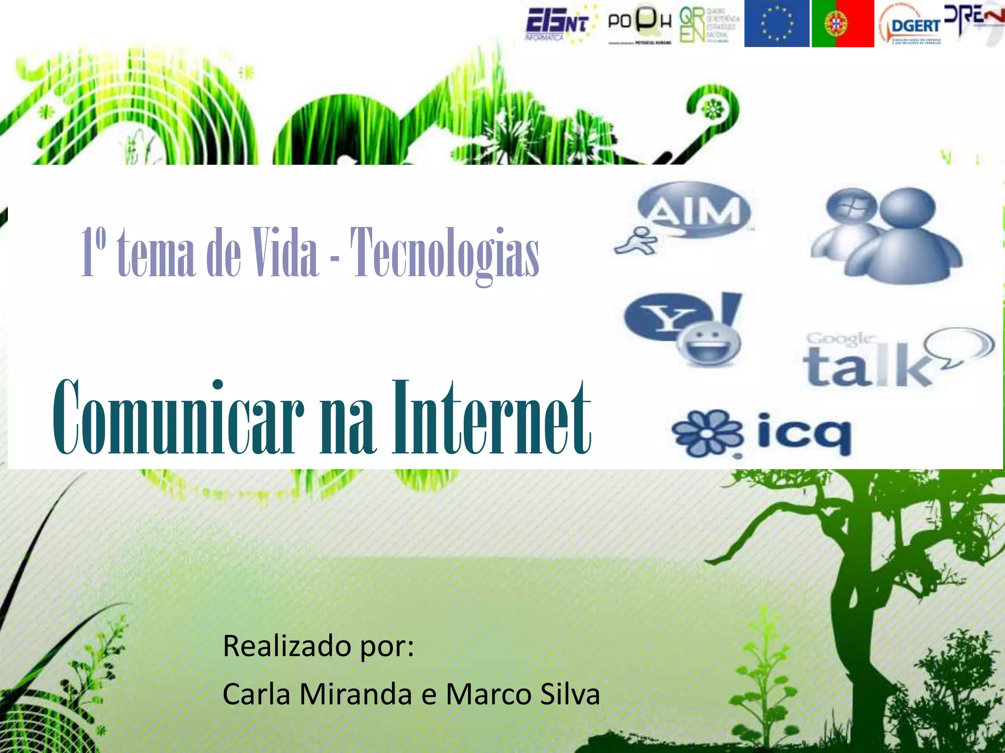Este documento discute várias formas de comunicação na internet, incluindo conversações em tempo real através de chamadas de telefone, videoconferência, e serviços como MSN Messenger, IRC, AIM, Talk e videoconferência. Ele também descreve como essas tecnologias ajudaram as pessoas a se comunicarem com familiares e amigos de maneira fácil.