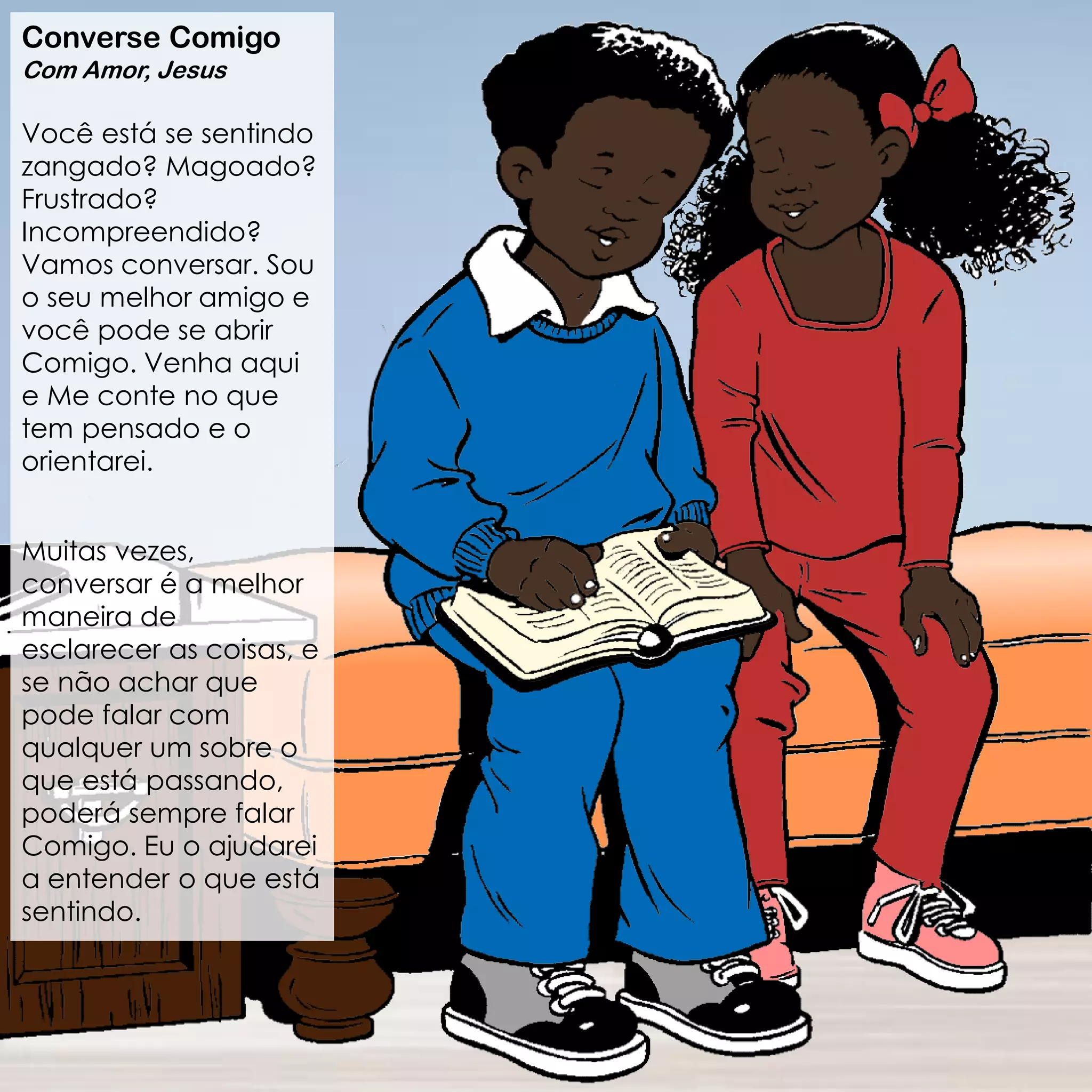 O documento aborda a importância de conversar sobre emoções e oferece apoio amoroso para aqueles que se sentem zangados, magoados ou incompreendidos. Destaca que abrir-se e dialogar pode ajudar a entender e gerir os sentimentos, levando a escolhas mais saudáveis e à verdadeira felicidade. Além disso, enfatiza que essa conversa pode ocorrer em um ambiente seguro e acolhedor, representado pela figura de Jesus como amigo e conselheiro.
