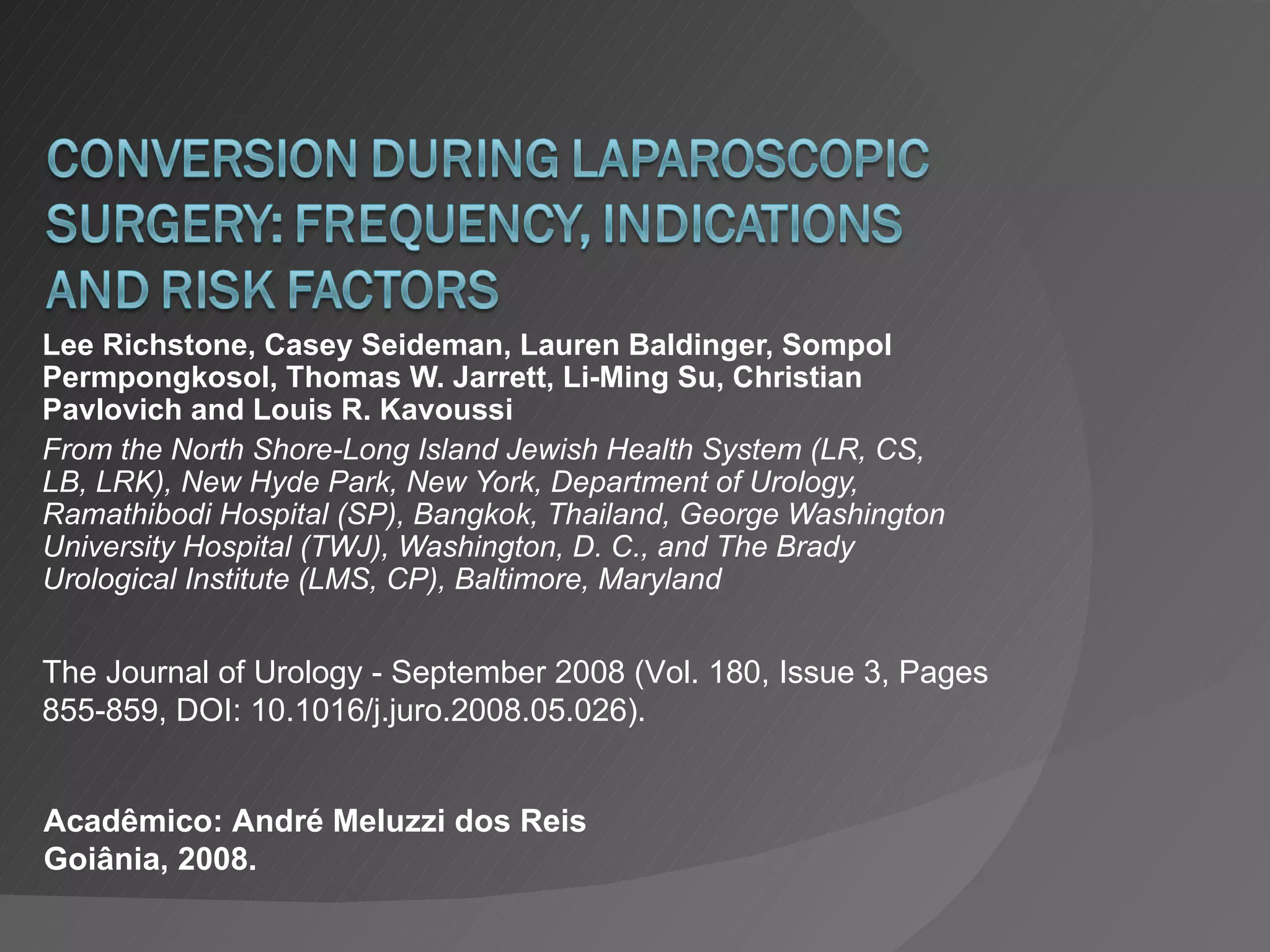 Este estudo analisa a taxa de conversão de procedimentos laparoscópicos para laparotomia aberta em urologia, com base em 2.128 casos realizados entre 1993 e 2005, observando uma taxa de conversão de 3,2% que diminuiu com a experiência do cirurgião. As principais indicações para conversão foram lesões vasculares e a idade do paciente foi o único fator significativamente associado a maior risco de conversão. As conclusões ressaltam a importância de considerar a dinâmica da taxa de conversão no aconselhamento pré-operatório.