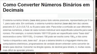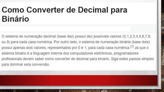 O documento explica como converter números binários para decimal através de algumas etapas: 1) Listar as potências de 2 correspondentes aos dígitos binários; 2) Multiplicar cada dígito pelo valor da potência de 2 correspondente; 3) Somar os resultados para obter o número decimal equivalente. Também mostra como converter números entre sistemas binário, decimal e hexadecimal.