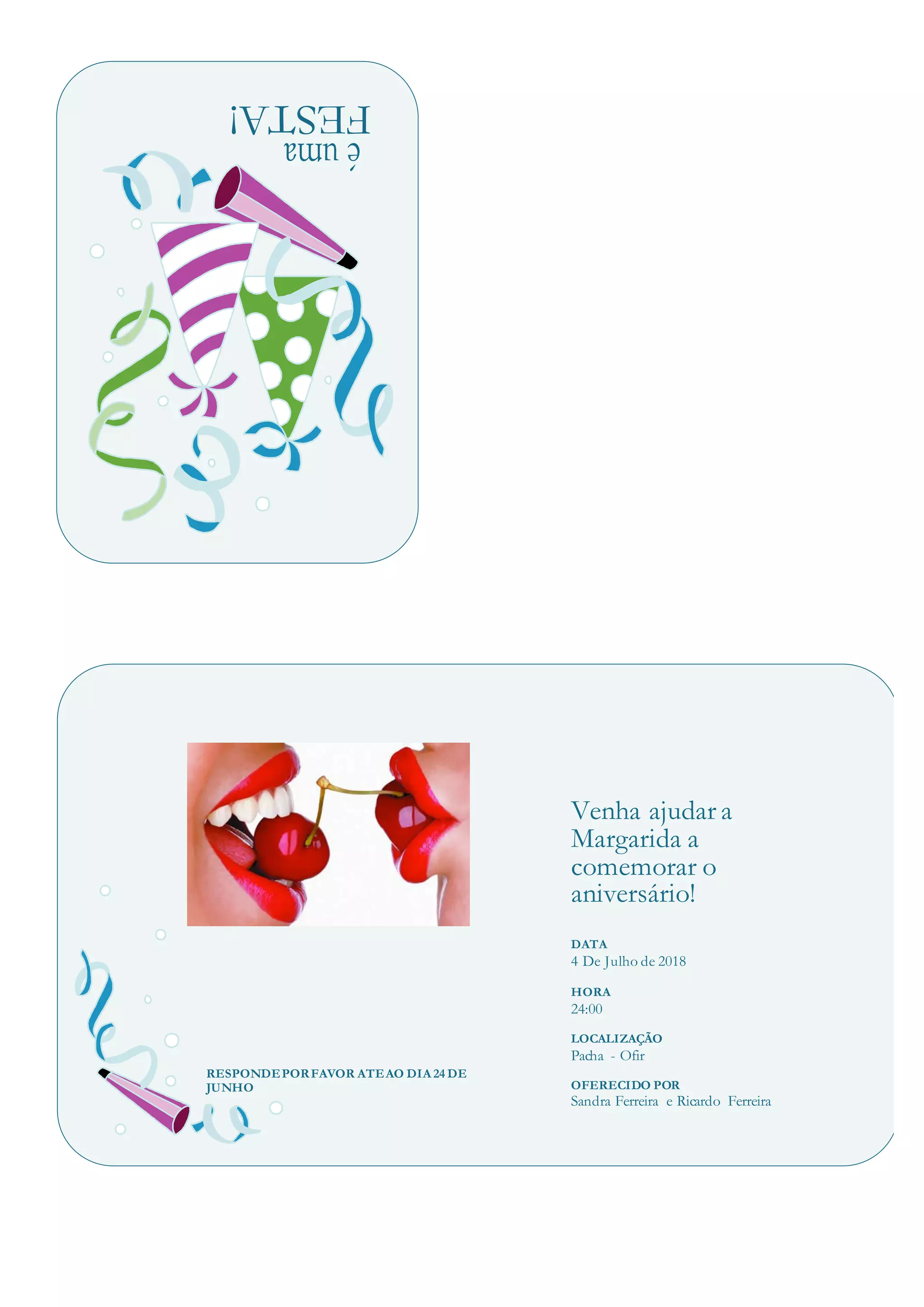 Margarida está comemorando seu aniversário no dia 4 de julho de 2018 às 24:00 no Pacha - Ofir. Sandra e Ricardo Ferreira convidam para responder até 24 de junho.