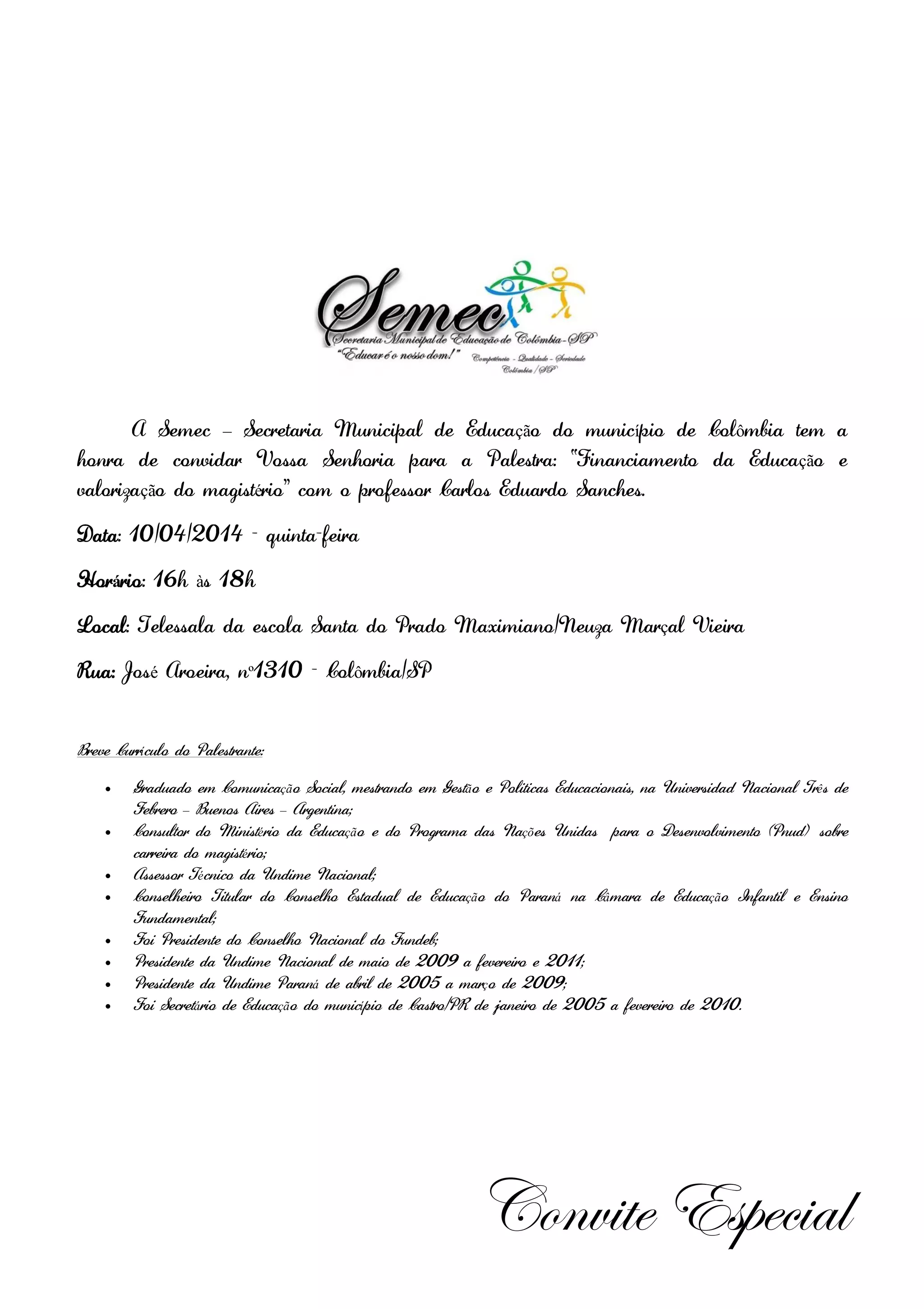 O documento convida para uma palestra sobre "Financiamento da Educação e valorização do magistério" com o professor Carlos Eduardo Sanches na escola Santa do Prado Maximiano em 10 de abril de 2014. O palestrante tem experiência como consultor do MEC e PNUD, assessor da Undime Nacional, conselheiro do Conselho Estadual de Educação do Paraná e ex-secretário de Educação de Castro/PR.