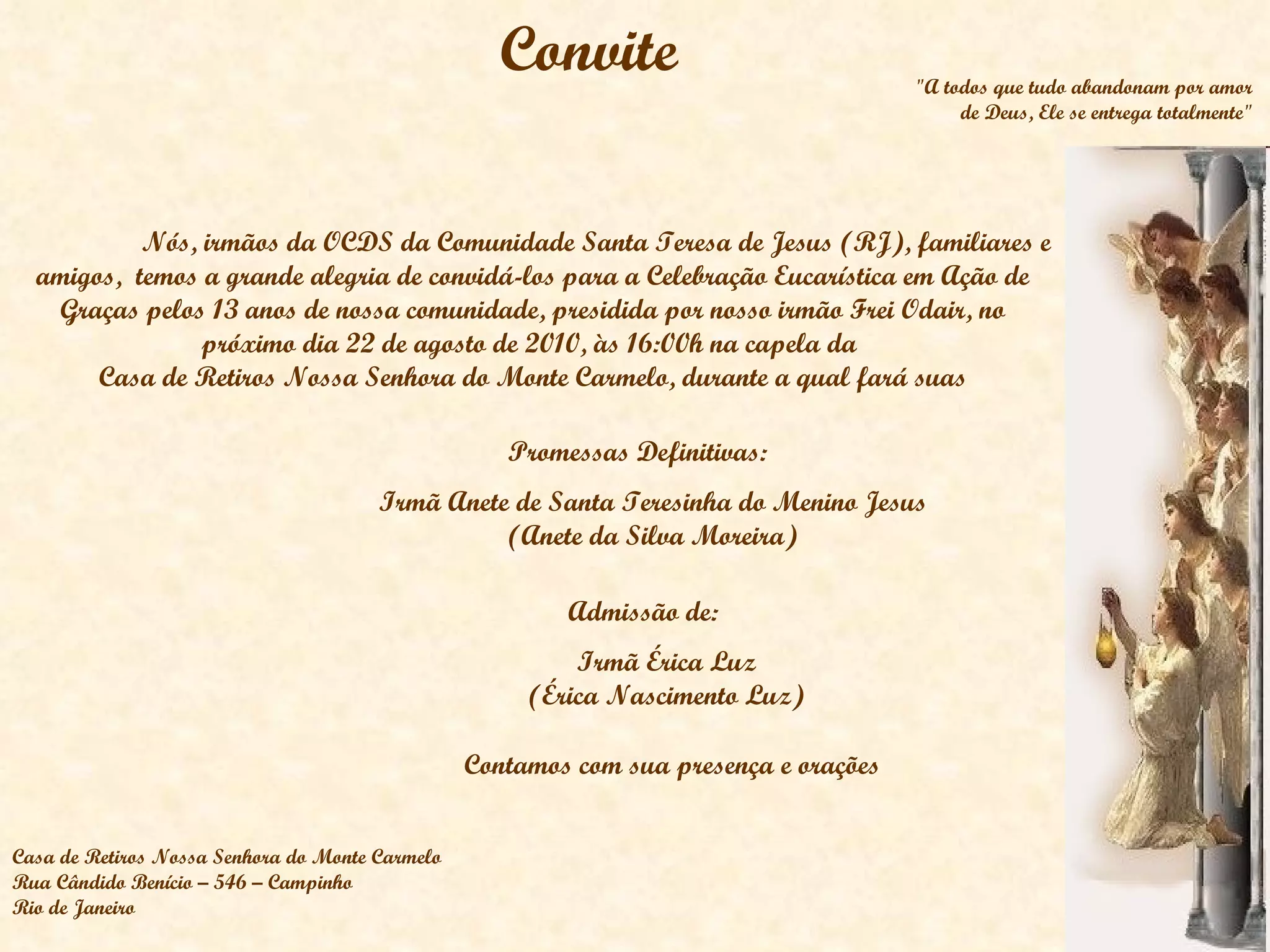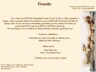 A comunidade convida para uma celebração eucarística em agradecimento pelos 13 anos da comunidade e para a cerimônia de promessas definitivas da Irmã Anete de Santa Teresinha do Menino Jesus e admissão da Irmã Érica Luz.