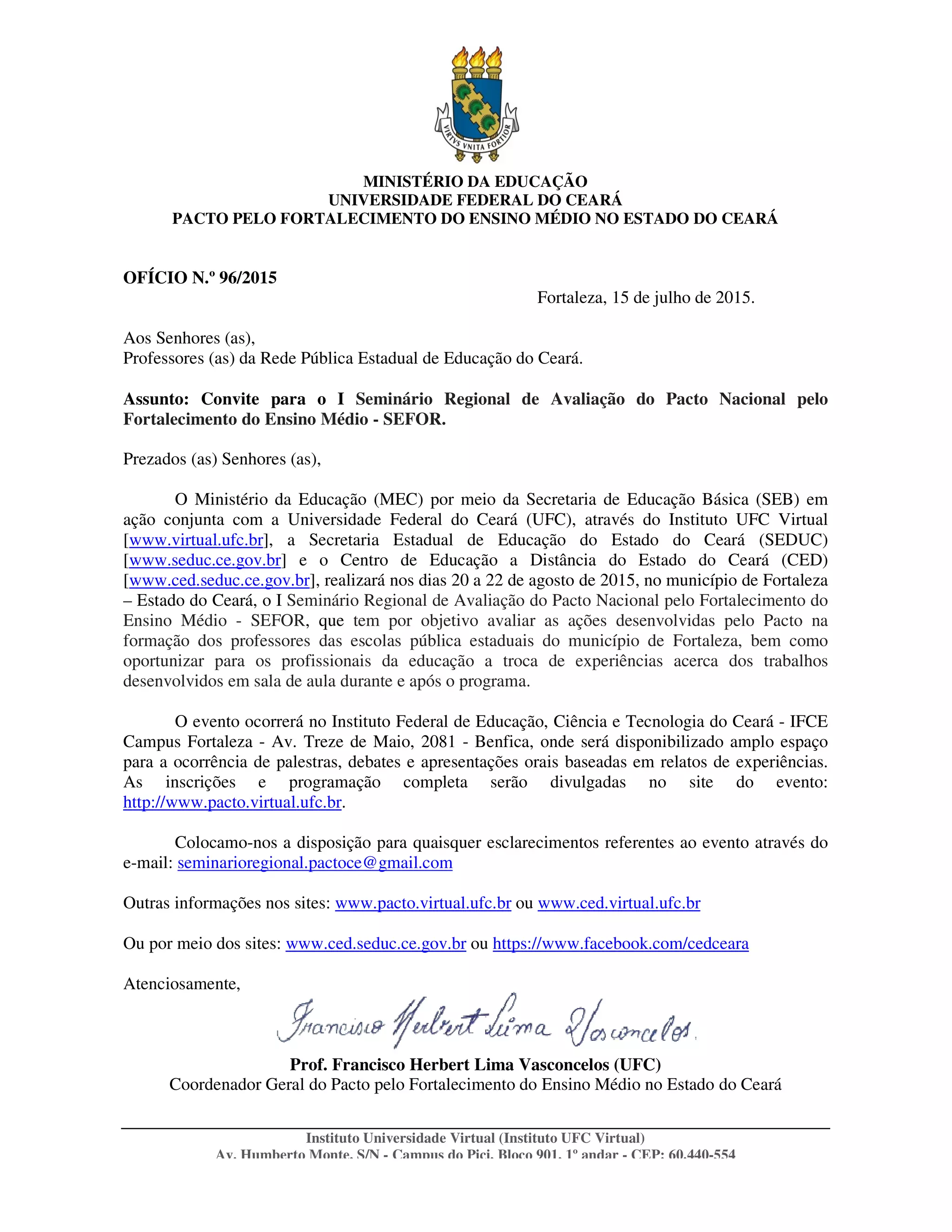 O documento convida professores da rede pública estadual de educação do Ceará para o I Seminário Regional de Avaliação do Pacto Nacional pelo Fortalecimento do Ensino Médio. O evento será realizado de 20 a 22 de agosto de 2015 no Instituto Federal de Educação, Ciência e Tecnologia do Ceará em Fortaleza e terá como objetivo avaliar as ações desenvolvidas pelo Pacto e permitir troca de experiências entre educadores. Mais detalhes estarão disponíveis no site listado.