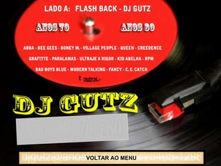 VOLTAR AO MENUA emoção da música.... A viagem de volta ao passado.... sinta a magia dos velhos tempos curtindo... som, iluminação, telão, gelo seco..... tudo sob o comandado do..... DJ GUTZ. 2º Flashback no Clube Antonio e Maria Dia 02 de agosto Início: 22:30 h Participe, será uma noite especial !!!