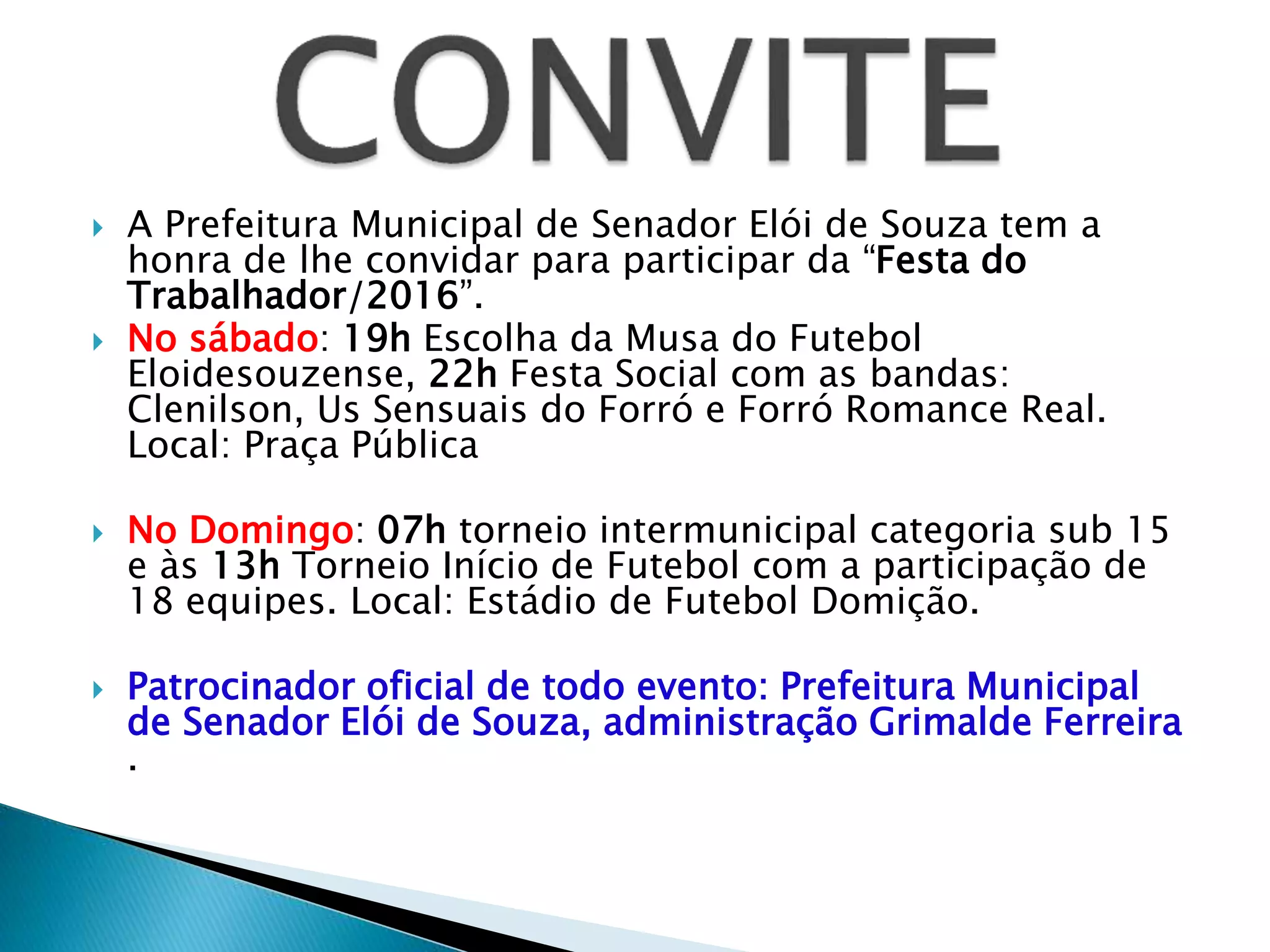 A Prefeitura de Senador Elói de Souza convida para a Festa do Trabalhador no sábado com escolha da Musa do Futebol e shows, e no domingo com torneios de futebol sub-15 e de 18 equipes, patrocinado pela própria prefeitura.
