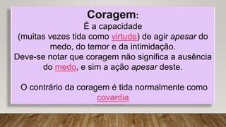 O documento discute a importância da coragem para enfrentar os desafios da vida. A coragem é ancorada na fé em Deus e ajuda a perseverar nos objetivos mesmo diante das dificuldades. Jesus ensinou que embora seu reino ainda não esteja na Terra, ele trabalha para estendê-lo aos corações por meio de seus discípulos.
