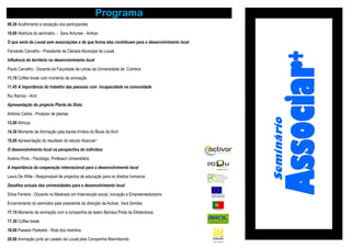 O documento é um convite para um seminário sobre cooperação e desenvolvimento local na Lousã, Portugal, a realizar-se em 3 de junho de 2011 no Meliá Palácio Hotel da Lousã. O seminário inclui apresentações sobre o papel das associações locais, influência do território no desenvolvimento, projetos de inclusão e cooperação internacional. Inscreva-se até 25 de maio enviando os dados de contato para a Activar, organizadora do evento.