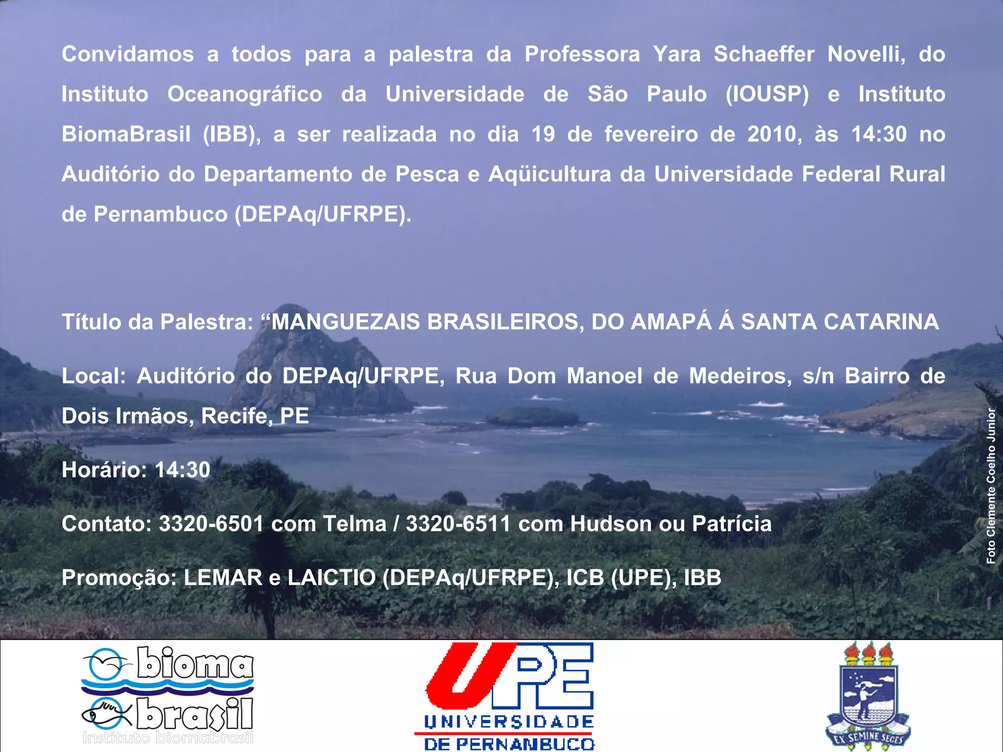 O documento convida para uma palestra da Professora Yara Schaeffer Novelli no dia 19 de fevereiro de 2010 às 14:30 no auditório do Departamento de Pesca e Aqüicultura da Universidade Federal Rural de Pernambuco sobre "Manguezais Brasileiros, do Amapá á Santa Catarina".
