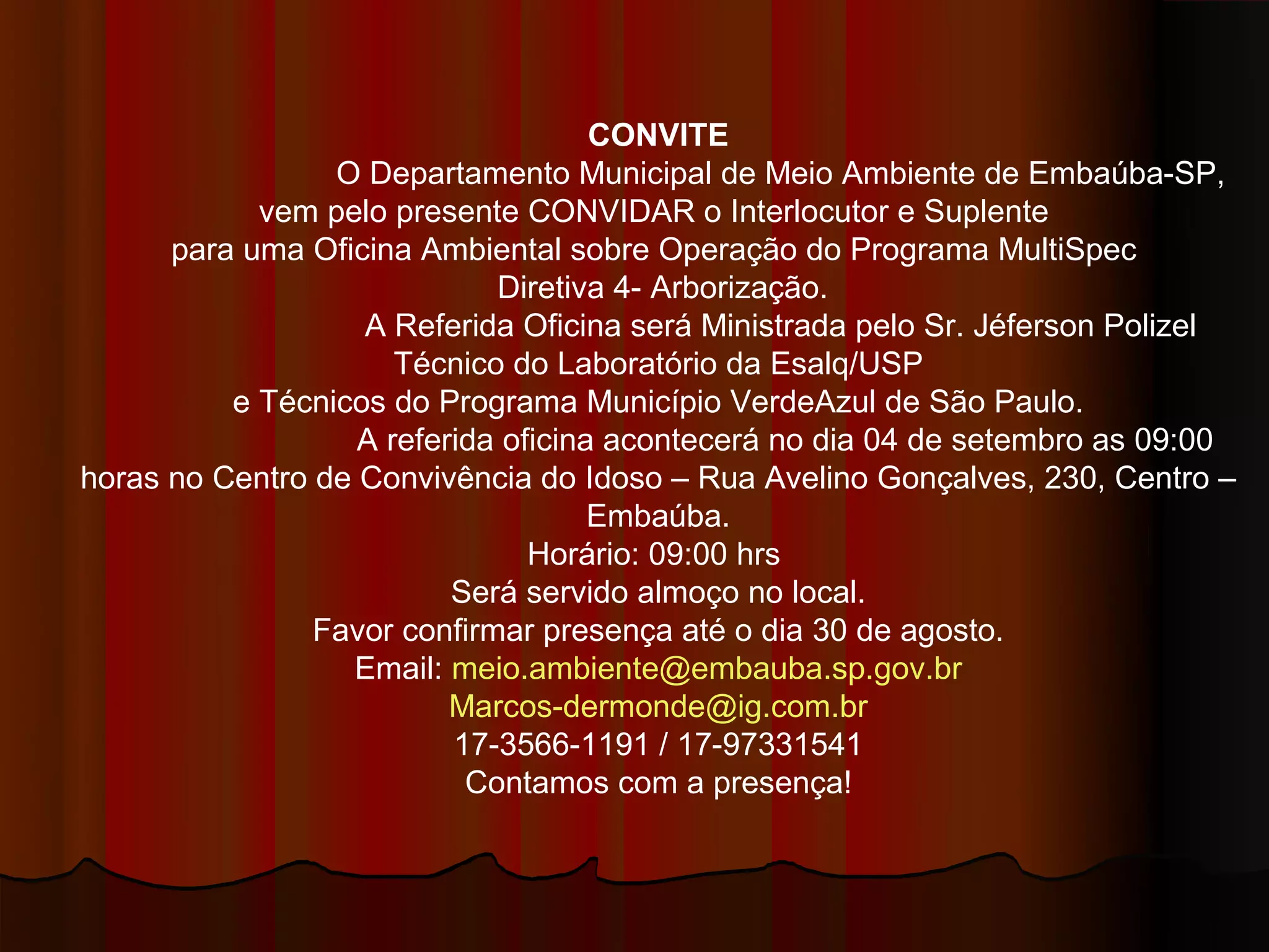 O Departamento Municipal de Meio Ambiente de Embaúba-SP convida o interlocutor e suplente para uma oficina ambiental sobre operação do Programa MultiSpec Diretiva 4 - Arborização que será ministrada por técnicos do Laboratório da Esalq/USP e do Programa Município VerdeAzul de São Paulo no dia 4 de setembro às 9 horas no Centro de Convivência do Idoso.