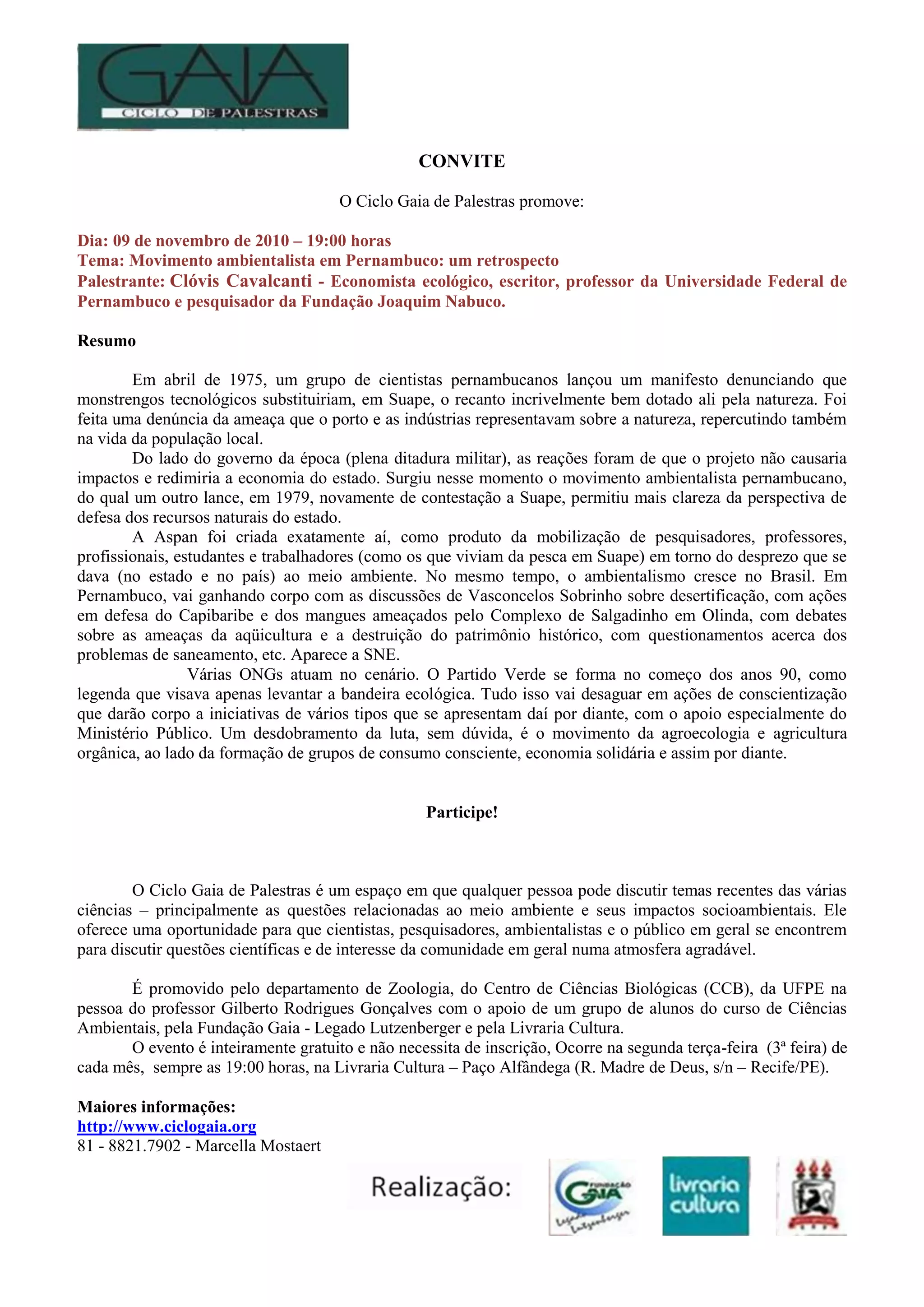 1) O documento convida para uma palestra em 9 de novembro de 2010 sobre o movimento ambientalista em Pernambuco, com o palestrante Clóvis Cavalcanti.