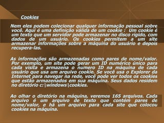 Cookies são arquivos de texto armazenados no navegador do usuário que permitem aos sites armazenar e recuperar informações sobre visitantes. Cookies contêm pares de nome/valor e são usados por sites para personalização, análise de tráfego e mecanismos como carrinhos de compras. Embora úteis, cookies também apresentam problemas relacionados à privacidade e compartilhamento de dispositivos.