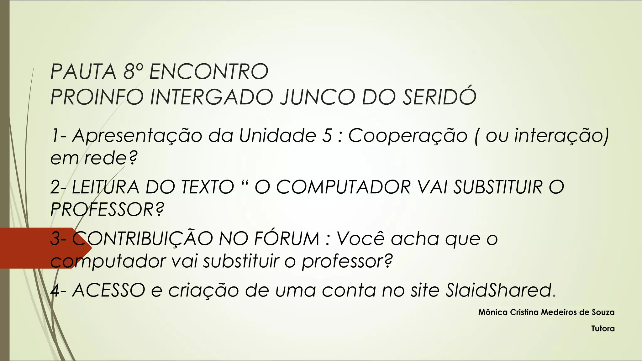A reunião discutiu a Unidade 5 sobre cooperação em rede, leu o texto "O computador vai substituir o professor?" e pediu contribuições no fórum sobre se computadores podem substituir professores. Os participantes também aprenderam a acessar e criar contas no site SlaidShared.