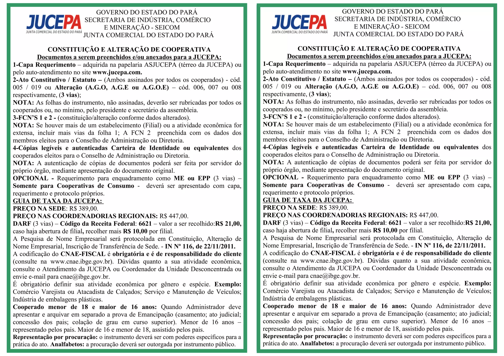 Este documento lista os documentos e informações necessários para a constituição e alteração de cooperativas perante a Junta Comercial do Estado do Pará (JUCEPA), incluindo ato constitutivo, estatuto, dados dos membros, taxas e formalidades de convocação.