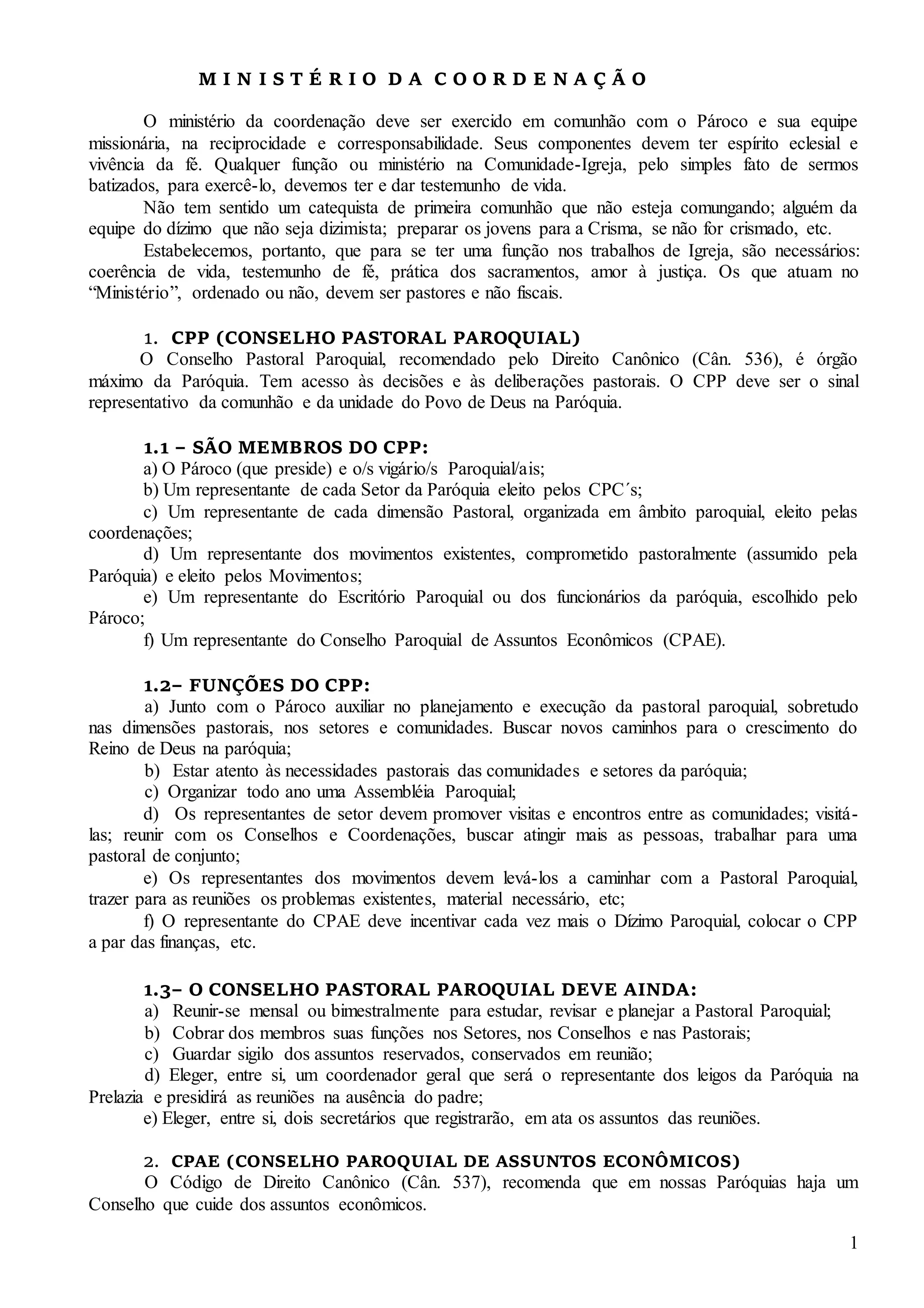 1) O documento fornece diretrizes sobre a organização de conselhos e lideranças nas comunidades e paróquias católicas, incluindo o Conselho Pastoral Paroquial, Conselho de Assuntos Econômicos e Conselho Pastoral Comunitário.