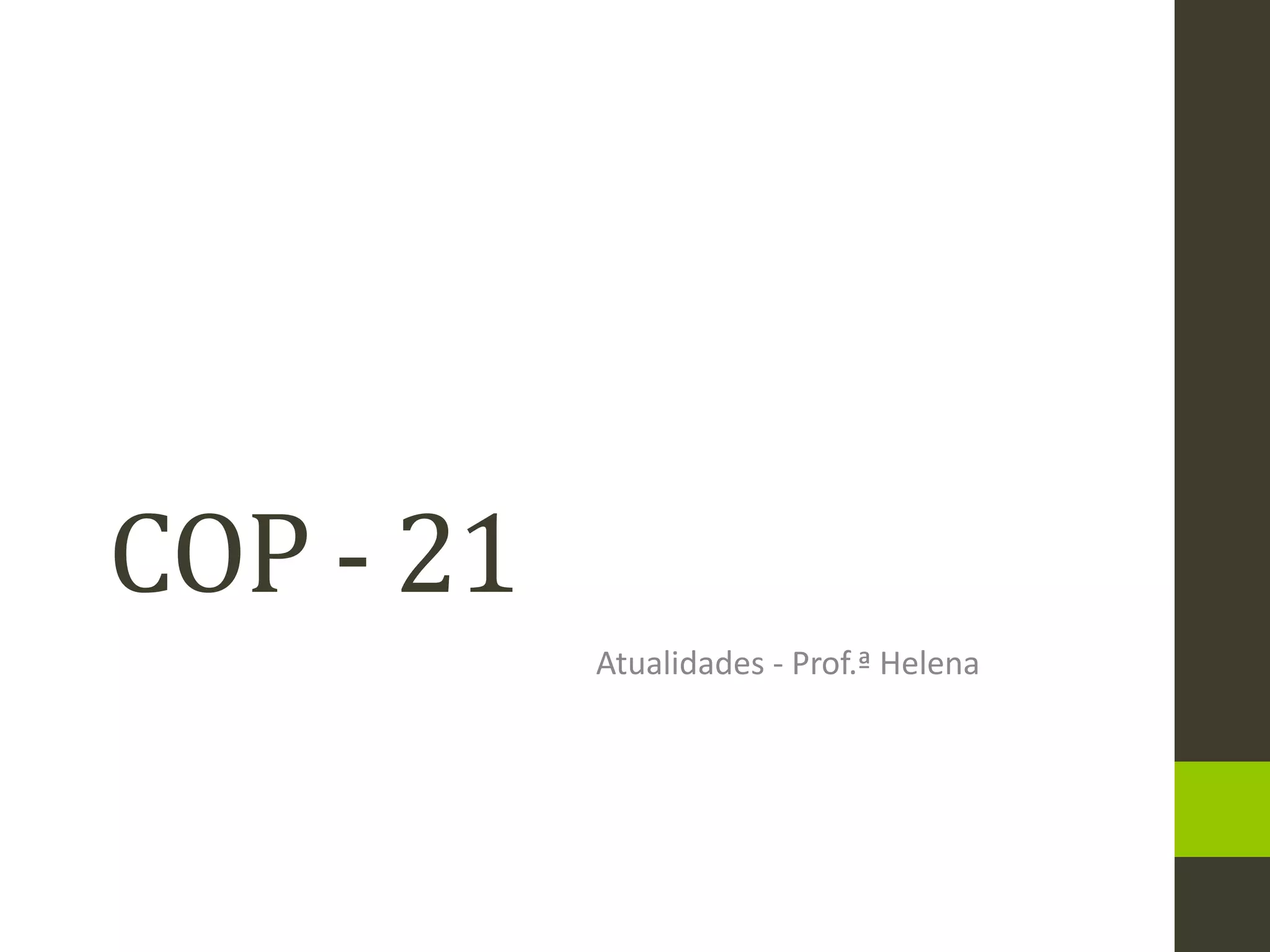 O documento resume a Conferência das Nações Unidas sobre Mudanças Climáticas de 2015 (COP21) em Paris, onde foi assinado o Acordo de Paris para limitar o aquecimento global abaixo de 2°C. O acordo estabelece metas voluntárias de redução de emissões para os países e financiamento de US$ 100 bilhões anuais para nações em desenvolvimento. Críticos apontam que as metas são insuficientes e não há obrigações legais para cumpri-las.