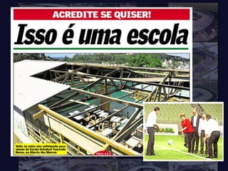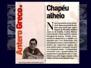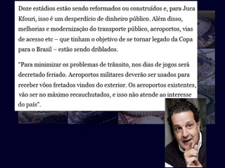 O documento critica o desperdício de bilhões de reais para a construção de estádios para a Copa do Mundo que se tornarão elefantes brancos, em detrimento da educação e saúde públicas no Brasil. Denuncia a má gestão dos recursos públicos e a indiferença dos políticos às reais necessidades da população, especialmente das crianças pobres. Defende a importância da participação cidadã para pressionar por mudanças.