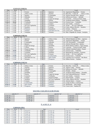 O documento apresenta a tabela da Copa do Interior de Futebol Amador de 2015 em Pernambuco, com os grupos e jogos da primeira fase entre times de várias cidades do interior do estado. A competição é organizada pela Federação Pernambucana de Futebol e divide os times em grupos de 4 equipes, que se enfrentam em jogos de ida e volta para definir os classificados às oitavas de final.