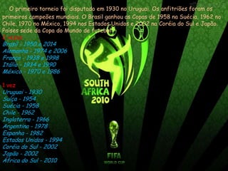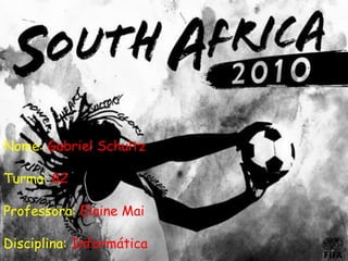 Gabriel Schultz está na turma 82 da disciplina Informática, sob a professora Elaine Mai. O documento lista informações sobre as Copas do Mundo de futebol, incluindo países-sede, maiores goleadas, detalhes sobre as bolas oficiais de 2010 e 2014 e sobre os troféus da competição. Também lista os 10 estádios que sediaram jogos da Copa do Mundo de 2010 na África do Sul.