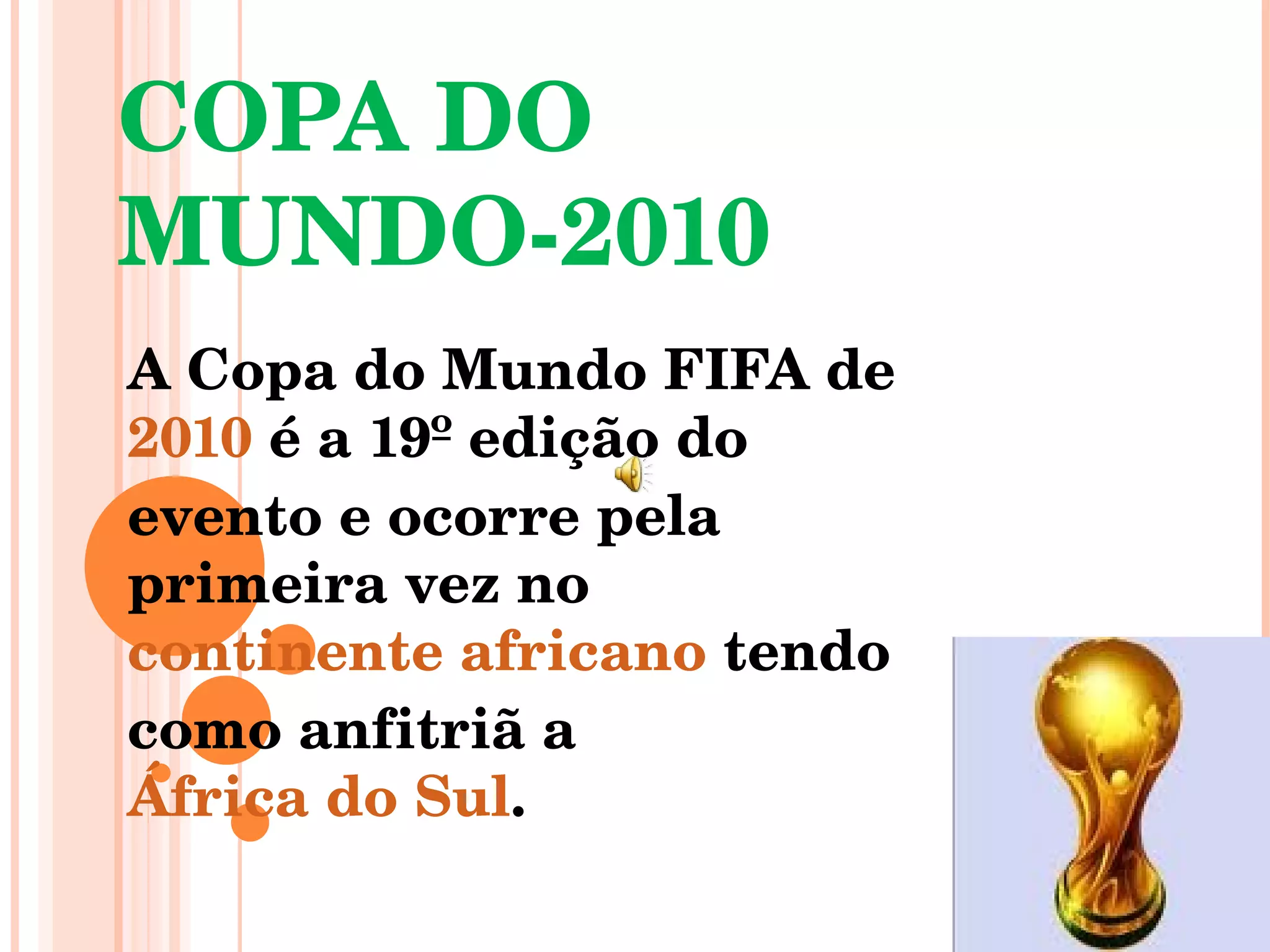 A Copa do Mundo de 2010 será a primeira vez que o evento ocorrerá na África, com a África do Sul como sede. O esporte é uma paixão nacional desde o século 19 e entre 11 de junho e 11 de julho de 2010, os jogos serão distribuídos em nove cidades de oito províncias sul-africanas, com mais de meio milhão de visitantes esperados no país.
