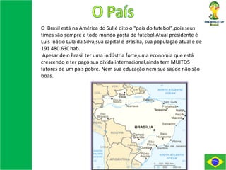 O Brasil sediará a Copa do Mundo de 2014 e precisa melhorar sua infraestrutura, como transporte e estádios, para receber o evento. Doze cidades brasileiras terão novos ou reformados estádios e melhorias na mobilidade e serviços para receber times, torcedores e transmissões.