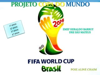 O documento aborda a Copa do Mundo de 2014 no Brasil, listando os estádios em várias cidades e mencionando o mascote do evento. Apresenta também as bandeiras dos países participantes organizados em grupos. O foco é no Brasil e seu objetivo de conquistar o hexa campeonato.