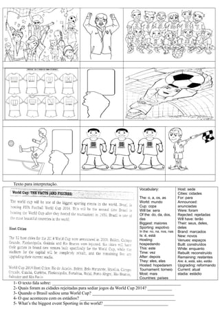 O documento fornece um vocabulário de futebol em português com termos como "árbitro", "bola", "campo", "goleiro" e "gol". Ele também fornece um vocabulário sobre a Copa do Mundo com termos como "The", "World Cup", "hosting", "venues" e "current stadia".