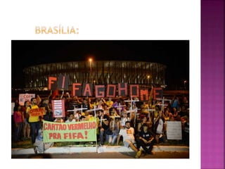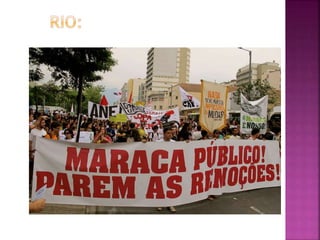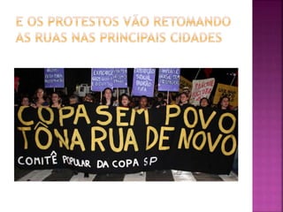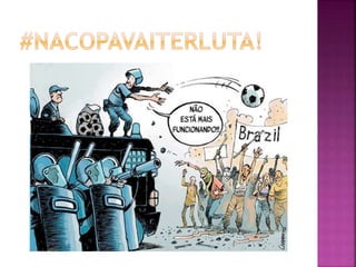 1) O documento critica os altos gastos públicos com a Copa do Mundo no Brasil que poderiam ter sido destinados à saúde, educação e habitação. 2) Milhares de famílias foram removidas de suas casas para a realização de obras e os empregos gerados são precários. 3) A FIFA obteve isenções fiscais e controle sobre áreas próximas aos estádios, enquanto o apoio popular à Copa vem diminuindo.