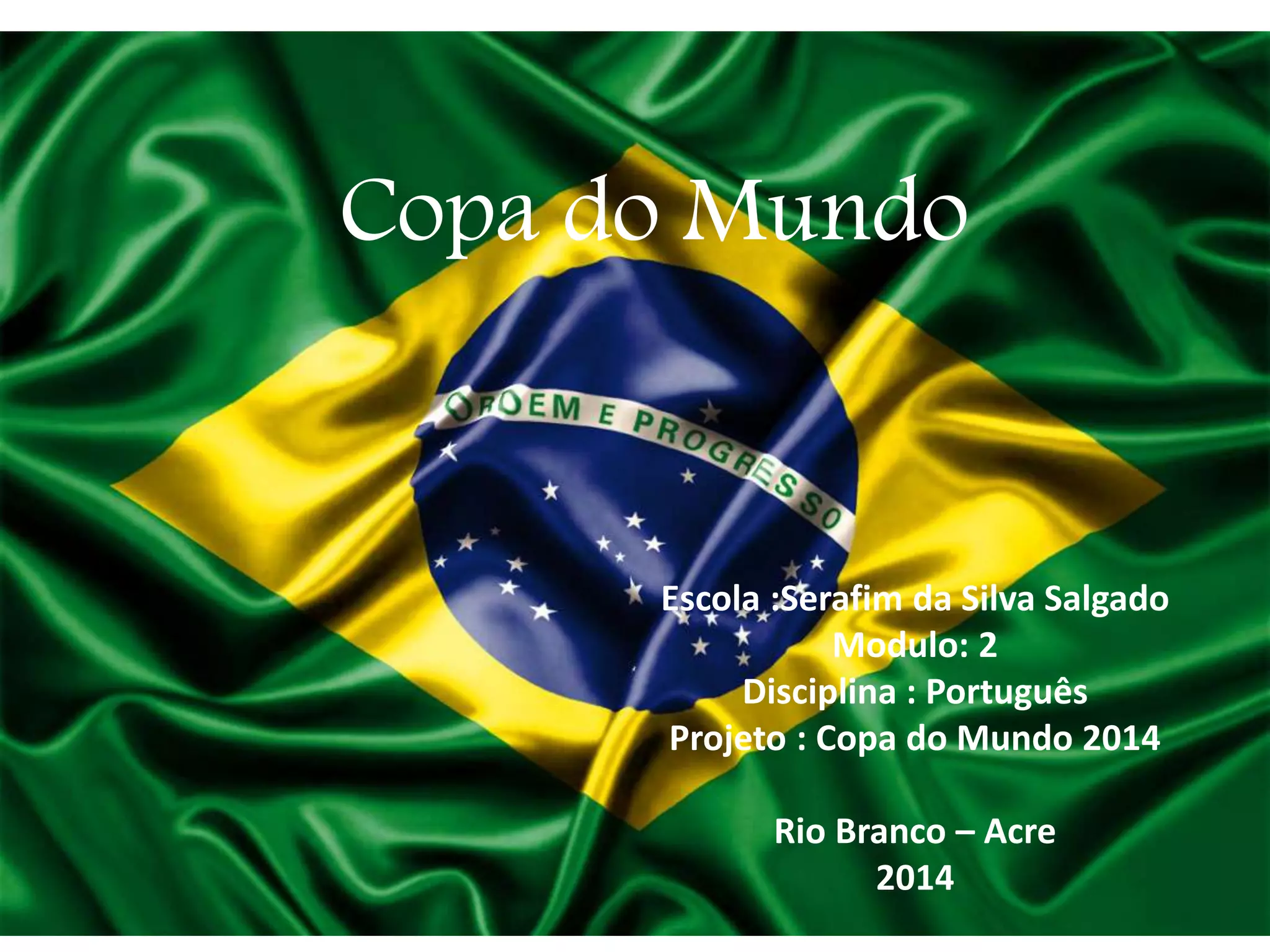 O documento apresenta um projeto sobre a Copa do Mundo de 2014 no Brasil, com detalhes sobre a justificativa do evento, o slogan, um roteiro de programa de rádio sobre a preparação do país, um outdoor promocional e uma notícia sobre o torneio.