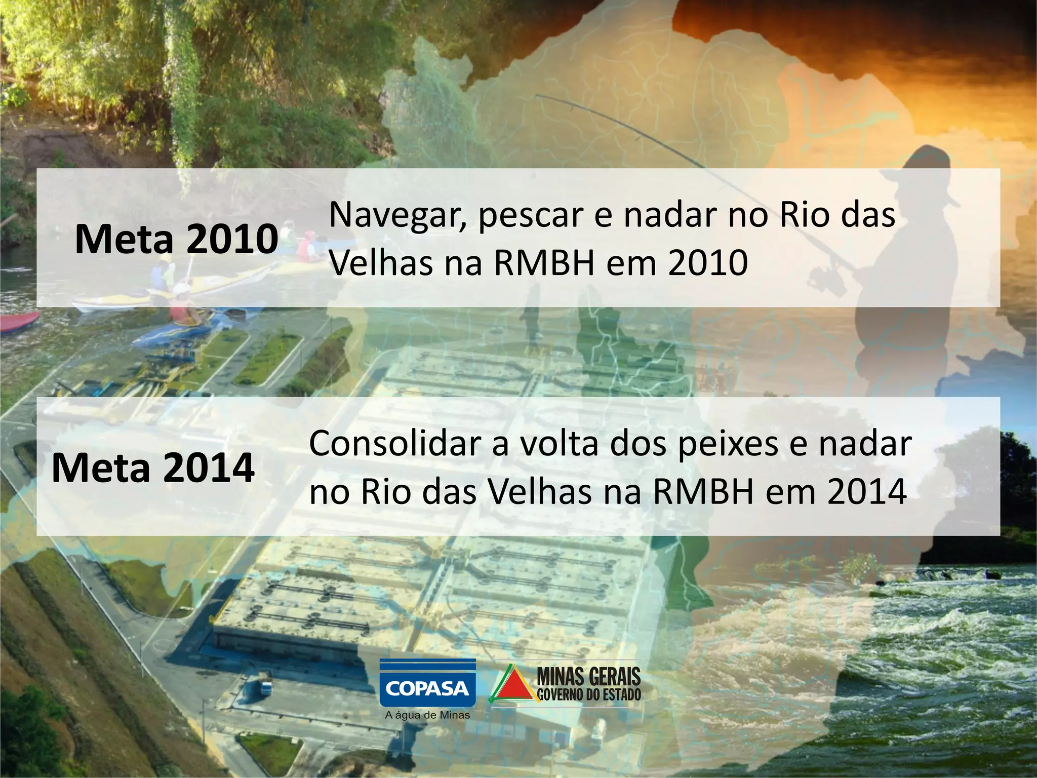 O documento descreve os planos e metas para melhorar a qualidade da água no Rio das Velhas na Região Metropolitana de Belo Horizonte entre 2010-2014. A meta de 2010 foi permitir natação e pesca no rio. A meta de 2014 é consolidar a volta dos peixes ao longo de todo o curso do rio na região. O documento detalha as ações planejadas pela companhia de saneamento COPASA para atingir essas metas, como a construção e melhoria de estações de tratamento de esgoto.