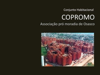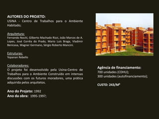 O documento descreve um conjunto habitacional de 1000 unidades em Osasco, São Paulo. Foi projetado pela Usina e construído entre 1995-1997 com financiamento da CDHU e autofinanciamento. O conjunto foi construído em mutirão com a participação dos moradores e fornece moradia para a população local de baixa renda.