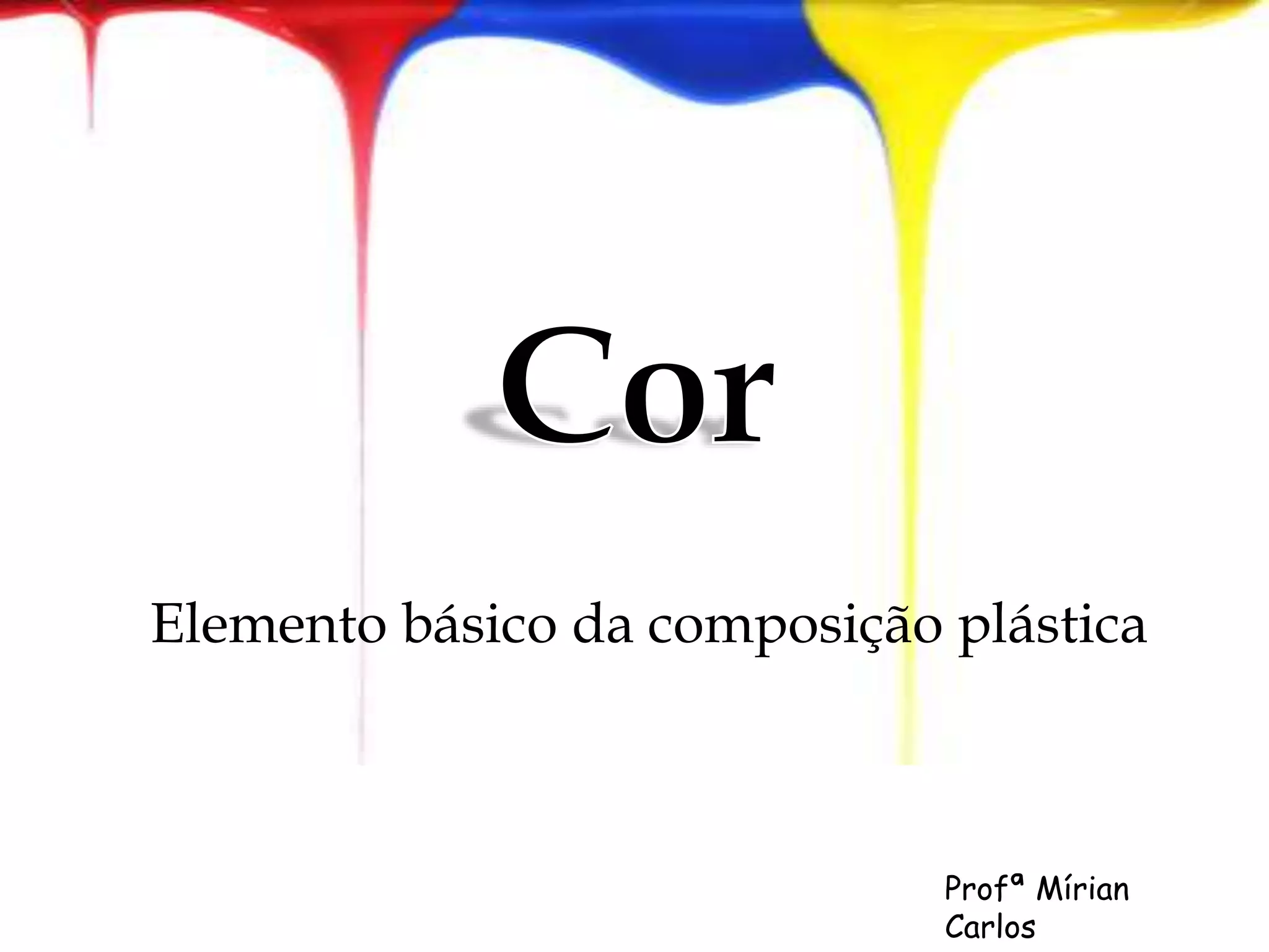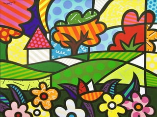 O documento discute as propriedades e classificações das cores, incluindo cores primárias, secundárias e terciárias. Também aborda como fatores como temperatura, contraste e valores influenciam a percepção das cores. Finalmente, apresenta o artista Romero Britto como exemplo de alguém que brinca com cores, formas e texturas em suas obras.