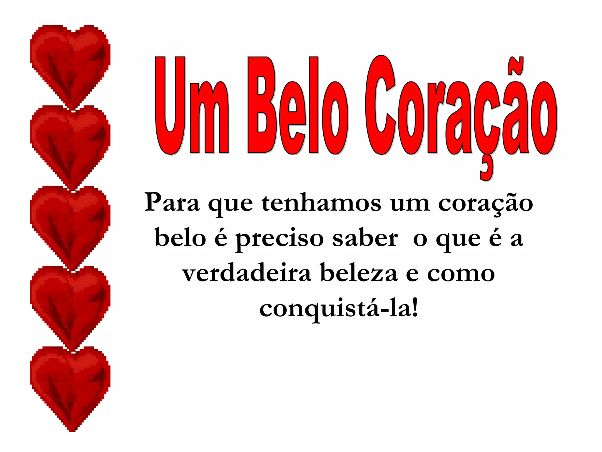 O documento fala sobre um jovem que acreditava ter o coração mais belo por estar perfeito e sem defeitos, até que um idoso aparece com um coração cicatrizado, explicando que cada marca representa amor dado a outras pessoas. No final, o jovem oferece um pedaço do próprio coração ao idoso, compreendendo que a verdadeira beleza está no amor compartilhado, não na perfeição física.