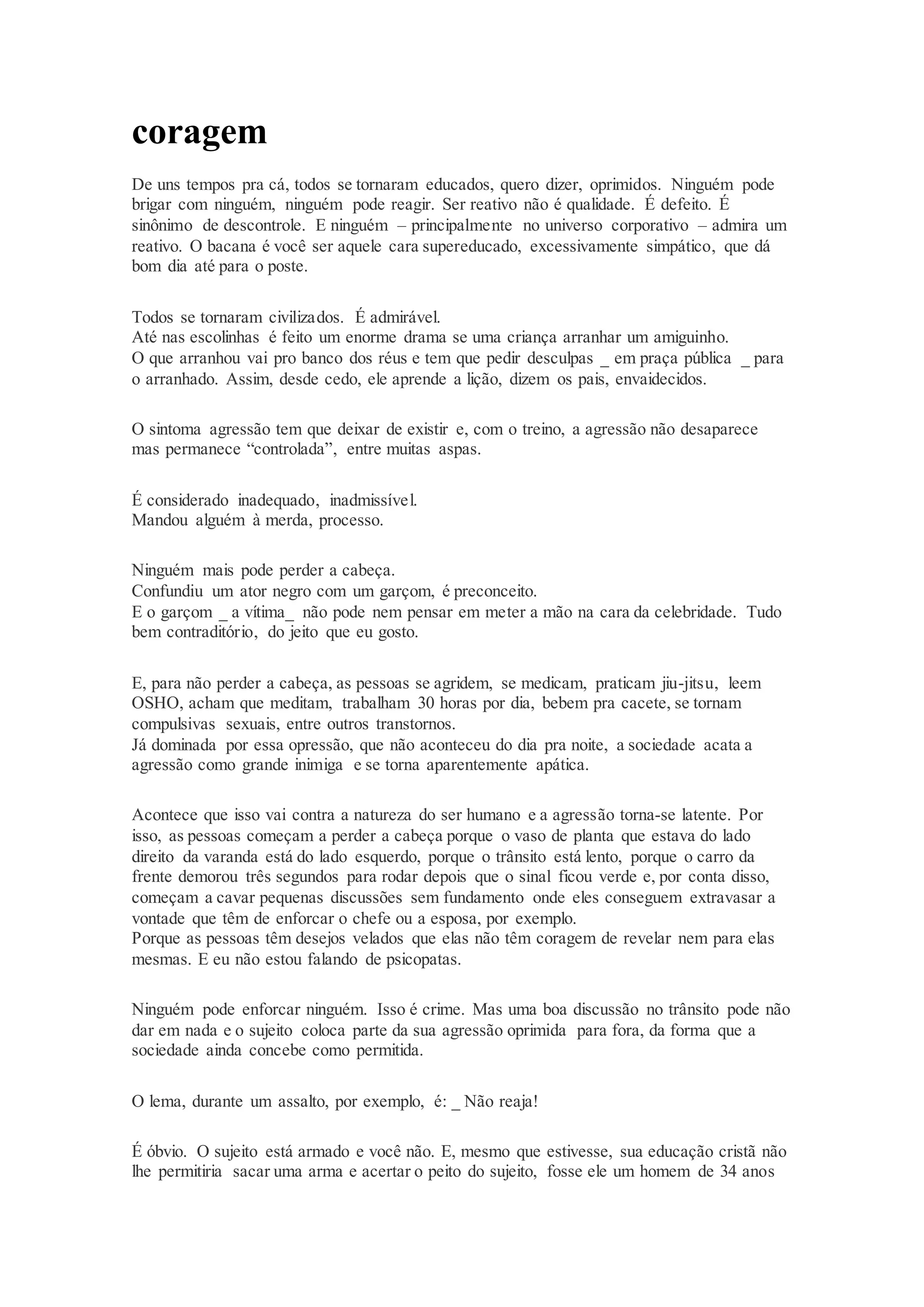 O documento critica a opressão social que desestimula a reação e a agressividade, levando as pessoas a reprimir seus instintos naturais. Essa repressão resulta em comportamentos compulsivos e explosões de raiva em situações cotidianas banais. Apesar de uma fachada de civilidade, a sociedade esconde um potencial agressivo que se manifesta de maneiras insustentáveis.