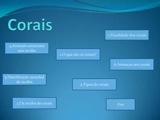 Os corais são animais que vivem em simbiose com algas e formam recifes coloridos nas águas tropicais. Os recifes abrigam grande biodiversidade e estão ameaçados pela poluição e mudanças climáticas causadas pela humanidade. Os maiores recifes são a Grande Barreira de Corais na Austrália, o de Belize e o Mar Vermelho.