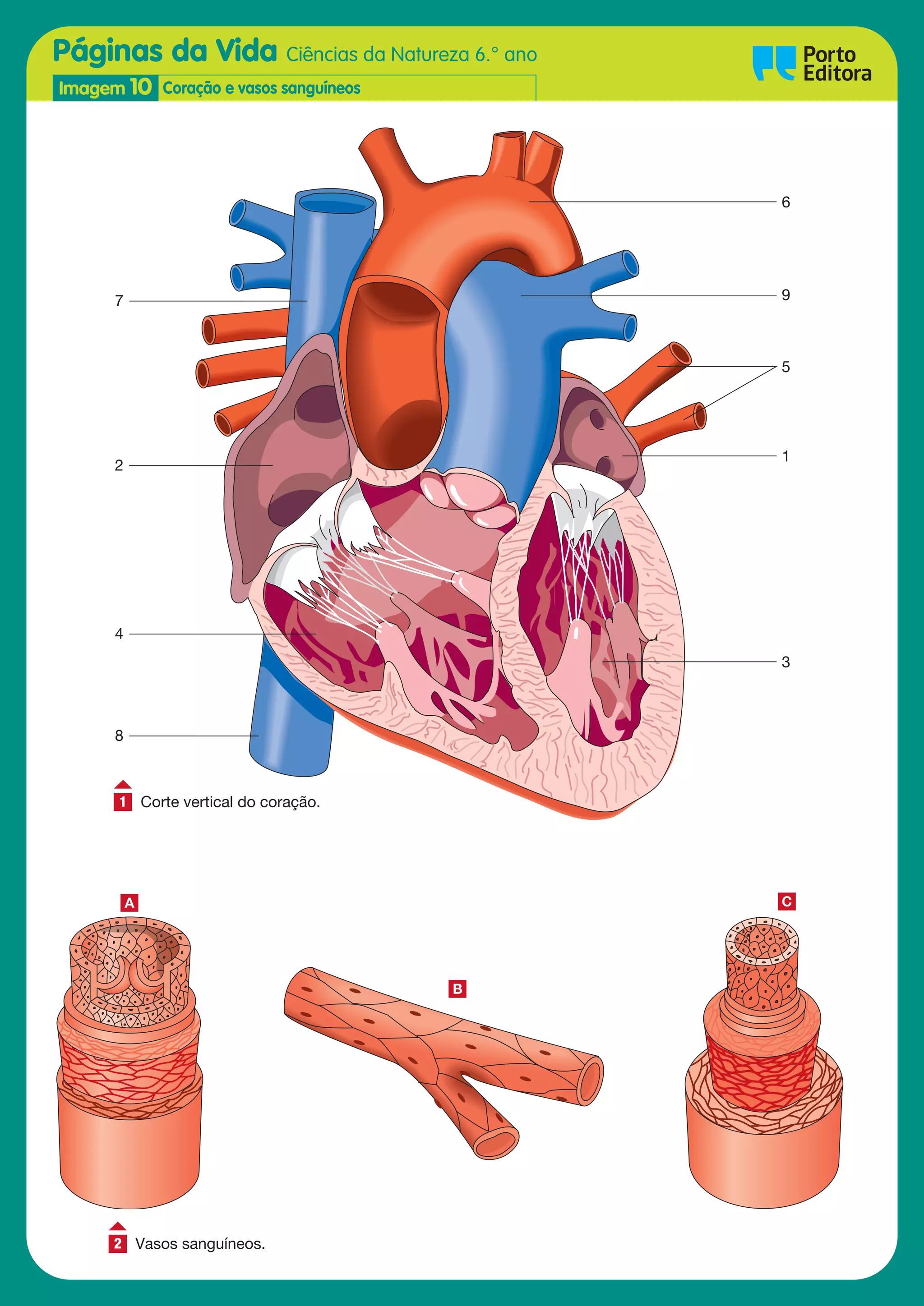 O documento apresenta uma imagem do coração humano com suas principais partes numeradas e identificadas, além de mostrar os principais vasos sanguíneos.