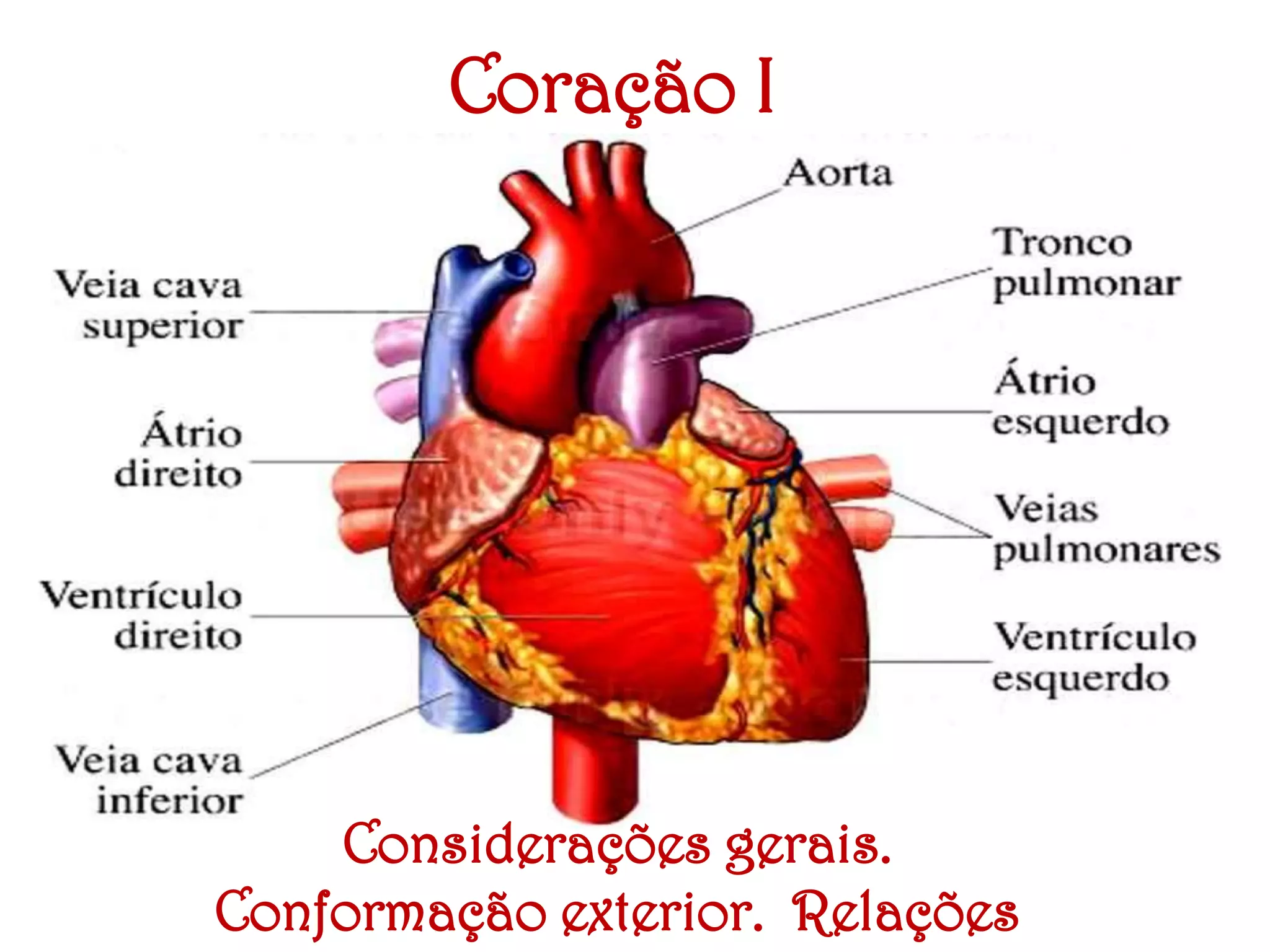 O documento descreve a anatomia do coração, incluindo sua localização no tórax, estrutura interna com câmaras e vasos, e relações com outros órgãos. O coração é dividido em metades direita e esquerda, cada uma com um átrio e ventrículo. Sua face anterior projeta-se no tórax e contém os óstios das válvulas cardíacas.