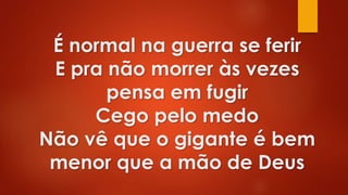 1) A música encoraja alguém que está com medo e perto de desistir, dizendo que o medo é normal mas Deus é maior. 2) Ela pede para não contar que a pessoa morreu, sugerindo que talvez ela apenas adormeceu por um tempo. 3) A música compara a situação da pessoa com Jesus, que parou de respirar por três dias para ressuscitar, sugerindo que há esperança.