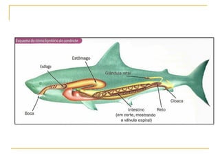 O documento descreve as principais características dos filos Cordados, incluindo Urocordados, Cefalocordados e Craniados. Os Craniados evoluíram para desenvolver crânio e vértebras protetoras. Dentro dos Craniados, são descritas as subclasses Agnatha, Chondrichthyes e Osteichthyes.